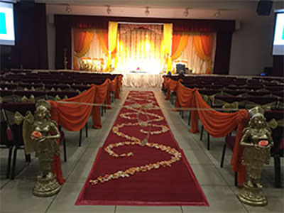 Badrinath Event Hall in Livermore, CA, is ideal for small to medium-sized weddings, featuring a Homa Kundam for traditional ceremonies and seating for up to 140 guests in lecture style or 112 in banquet style. The hall can be configured as two smaller spaces for more intimate events and includes a portable audio system. It is often used in combination with adjacent halls for dining and other wedding activities.
